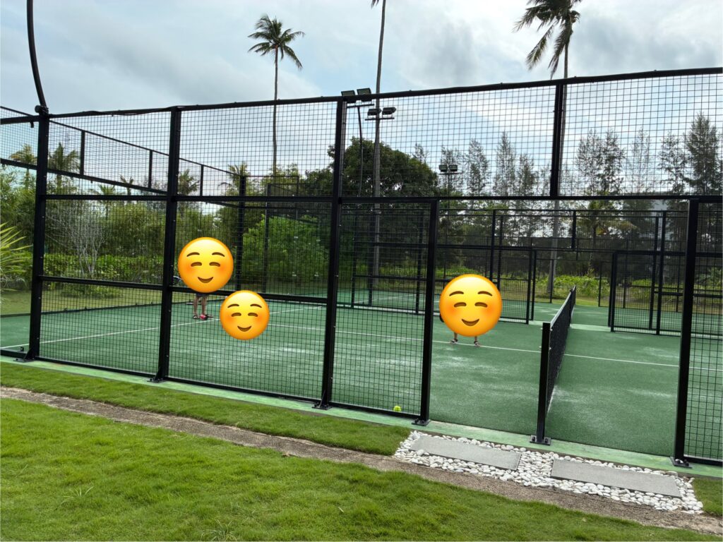 ちなみにパデルテニスとは、日本ではまだ珍しいスポーツで、テニスよりラリーが続きやすく、初心者向けのようです。周囲が透明な壁とフェンスで囲まれているのが特徴です。