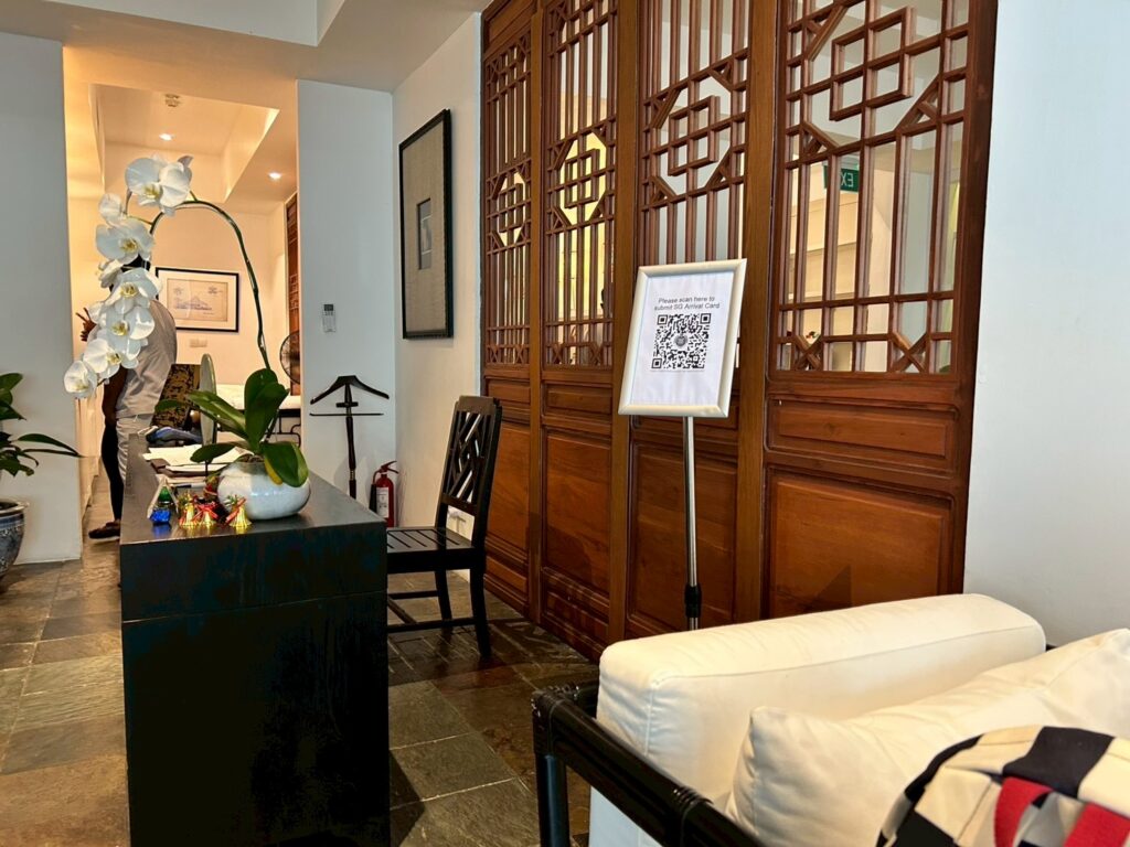フェリー到着後、ホテルの宿泊客は、エメラルドクラスの乗客と一緒に別レーンで入国審査を受けることができます。その後、宿泊者専用ラウンジへ。ホテルの送迎車がThe Sanchaya へ連れて行ってくれます。車での移動時間は約15分です。