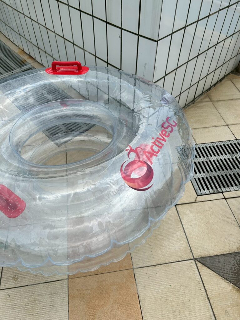 流れるプールと波の出るプールで使える無料の浮き輪があります。みなさん、使い終わると、あちこちに放置しているので、足りなくなることはなさそう。